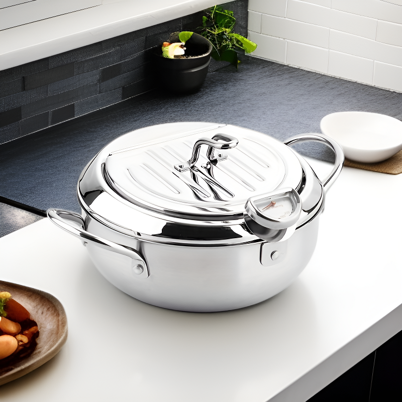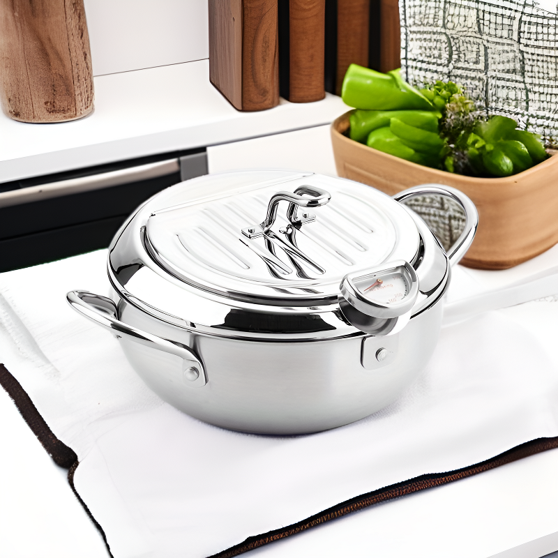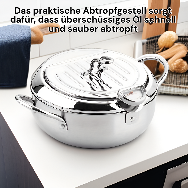 ● Hergestellt aus hochwertigem Edelstahl 304, ist die Fritteuse besonders langlebig, rostfrei und leicht zu reinigen – ideal für den täglichen Gebrauch in der Küche. ● Mit integriertem Ölthermometer können Sie die Temperatur präzise kontrollieren, sodass Ihre Speisen immer perfekt knusprig und goldbraun frittiert werden. ● Das praktische Abtropfgestell sorgt dafür, dass überschüssiges Öl schnell und sauber abtropft, wodurch Ihre Gerichte gesünder und weniger fettig werden. ● Die Fritteuse verfügt über einen ergonomischen Griff, der für sicheren Halt und komfortables Handling beim Frittieren sorgt – kein Verbrennen mehr! ● Vielseitig einsetzbar für verschiedene Gerichte wie Pommes, Chicken Nuggets oder Tempura – ein Muss für jeden Hobbykoch und Genießer.